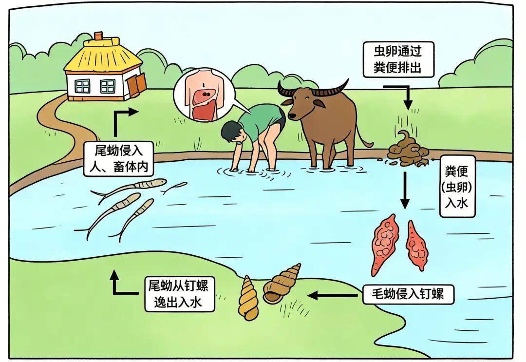 血吸虫病是一种人兽共患的寄生虫病,人和动物通过接触含血吸虫尾蚴的水体(称“疫水”)造成感染。血吸虫病曾是困扰我国长江流域及以南地区人民上千年的“瘟神”,经过多年的防治,目前已经成功实现传播阻断,但在大型湖泊周边和水网密布地区,血吸虫病的传播风险仍然不容忽视。